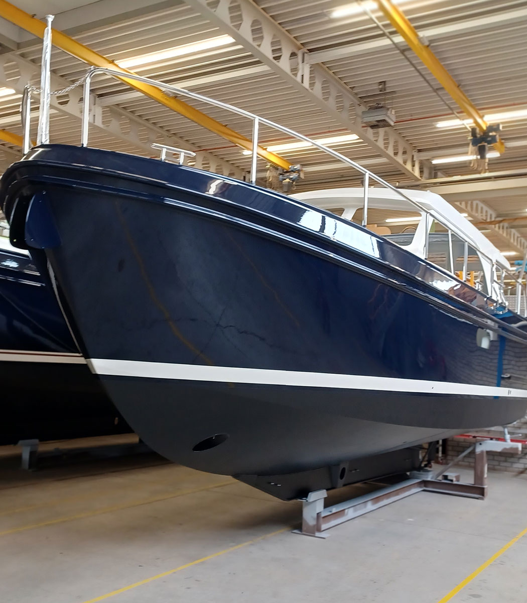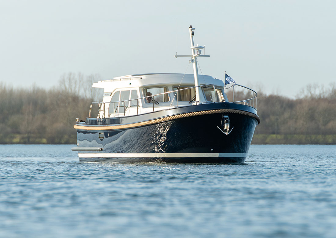 Dieses Schiff ist ein klassisches Boot für 2 Personen, die in einer geräumigen Doppelkabine im Vorschiff untergebracht sind. Die Kabine hat auch reichlich Schrankplatz und ist durch die Ausführung im warmen amerikanischen Kirschholz und den beiden Leselampen extrem gemütlich. Achtern der Vorkajüte schliesst sich an Steuerbord die Dusche mit bequemer Holzbank und Stehhöhe an. Backbord ist die völlig getrennte heizbare Nasszelle mit elektrischer Toilette und Waschbecken. Der große Salon bekommt eine besonders markante Note durch den Steuerstand mit einer Sitzbank für 1 Person. Die Salonbank hat das „easy convert system“ von Linssen. hier können also 2 weitere Personen schlafen. Das große, teakbelegte Achterdeck wird durch eine variable Cabriopersenning vor schlechtem Wetter geschützt, bei schönen stehen Ihnen viele Möglichkeiten und Varianten einer Teil- bis vollständigen Öffnung zur Verfügung. Eine Bank, ein Teaktisch und zwei bequeme Stühle runden das Mobiliar ab. Die Forelle besitzt ein verlängertes Dach (Longtop), das die Plicht noch stärker in den Salon integriert. Ein weiteres Highlight ist das sehr große Variodeck über dem Steuerstand, ein Schiebedach, das Ihnen während der Fahrt das Gefühl eines Außensteuerstandes vermittelt. Vom Achterdeck gelangen Sie durch ein bequemes, ebenerdiges Türchen auf die Badeplattform, wo selbstverständlich eine stabile klappbare Badeleiter mit Teakstufen sowie eine Kalt/Warm-Wasser Dusche das Baden zu einem Genuss werden lassen.Die Serienausstattung