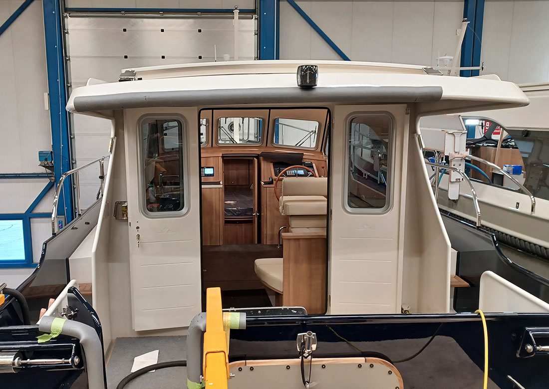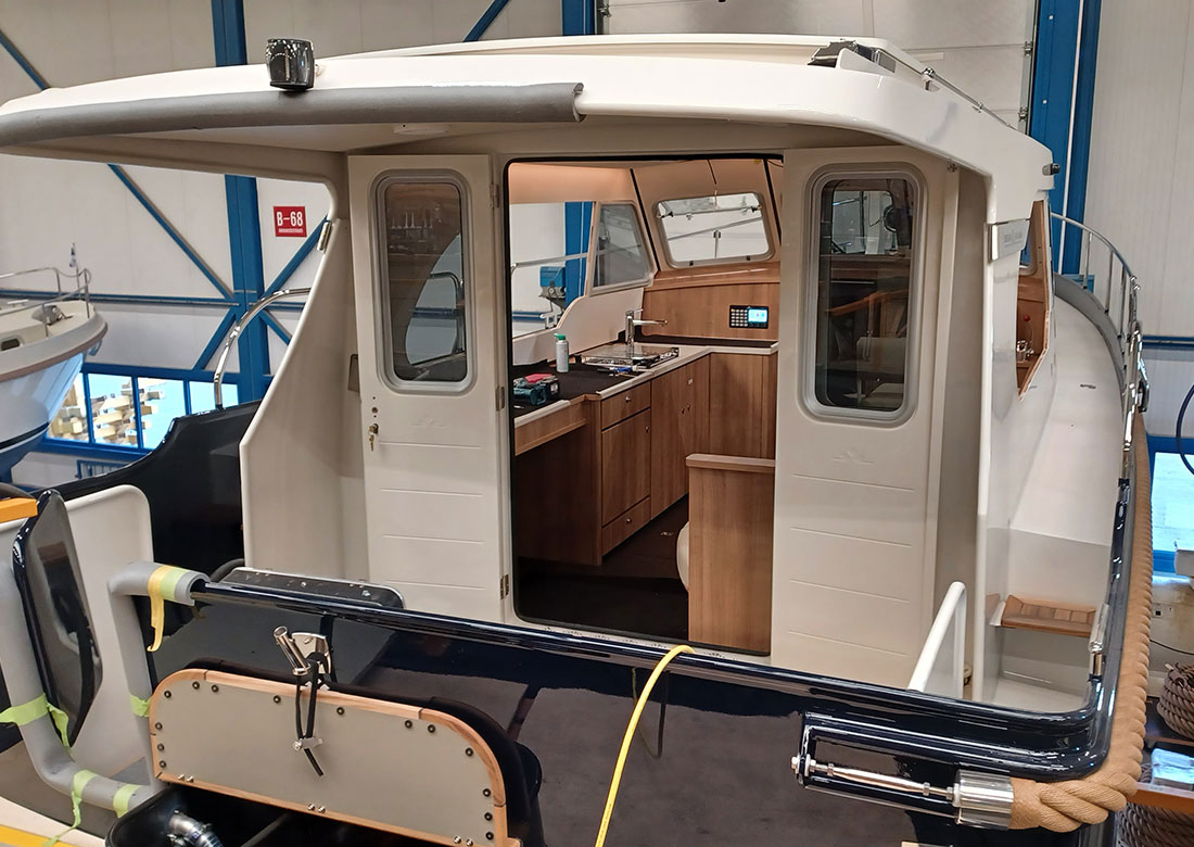 Amy ist fast fertig wie Sie den Bildern entnehmen können. Im Februar übernehmen wir das Schiff und dann kommt es mit dem LKW nach Mirow und wird im März erstmals auf der Seenplatte schwimmen.Dieses Schiff ist ein klassisches Boot für 2 Personen, die in einer geräumigen Doppelkabine im Vorschiff untergebracht sind. Die Kabine hat auch reichlich Schrankplatz und ist durch die Ausführung im warmen amerikanischen Kirschholz und den beiden Leselampen extrem gemütlich. Achtern der Vorkajüte schliesst sich an Steuerbord die Dusche mit bequemer Holzbank und Stehhöhe an. Backbord ist die völlig getrennte heizbare Nasszelle mit elektrischer Toilette und Waschbecken. Der große Salon bekommt eine besonders markante Note durch den Steuerstand mit einer Sitzbank für 1 Person. Die Salonbank hat das „easy convert system“ von Linssen. hier können also 2 weitere Personen schlafen. Das große, teakbelegte Achterdeck wird durch eine variable Cabriopersenning vor schlechtem Wetter geschützt, bei schönen stehen Ihnen viele Möglichkeiten und Varianten einer Teil- bis vollständigen Öffnung zur Verfügung. Eine Bank, ein Teaktisch und zwei bequeme Stühle runden das Mobiliar ab. Die Amy besitzt ein verlängertes Dach (Longtop), das die Plicht noch stärker in den Salon integriert. Ein weiteres Highlight ist das sehr große Variodeck über dem Steuerstand, ein Schiebedach, das Ihnen während der Fahrt das Gefühl eines Außensteuerstandes vermittelt. Vom Achterdeck gelangen Sie durch ein bequemes, ebenerdiges Türchen auf die Badeplattform, wo selbstverständlich eine stabile klappbare Badeleiter mit Teakstufen sowie eine Kalt/Warm-Wasser Dusche das Baden zu einem Genuss werden lassen.