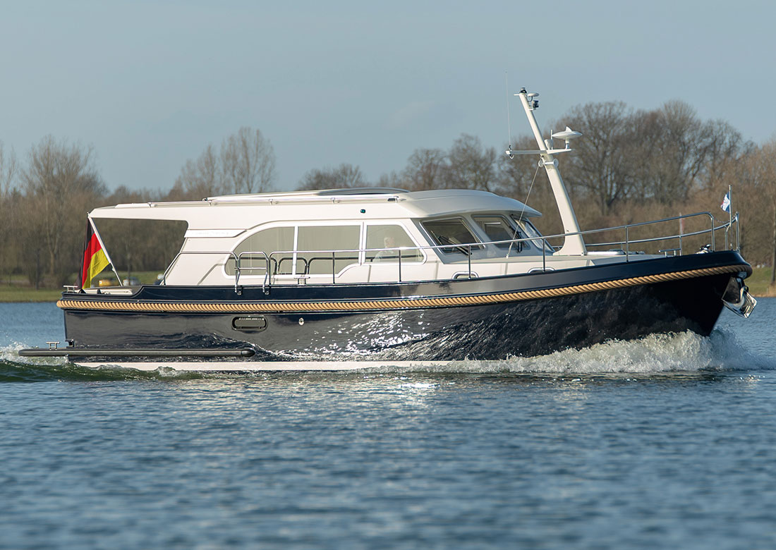 Dieses Schiff ist ein klassisches Boot für 2 Personen, die in einer geräumigen Doppelkabine im Vorschiff untergebracht sind. Die Kabine hat auch reichlich Schrankplatz und ist durch die Ausführung im warmen amerikanischen Kirschholz und den beiden Leselampen extrem gemütlich. Achtern der Vorkajüte schliesst sich an Steuerbord die Dusche mit bequemer Holzbank und Stehhöhe an. Backbord ist die völlig getrennte heizbare Nasszelle mit elektrischer Toilette und Waschbecken. Der große Salon bekommt eine besonders markante Note durch den Steuerstand mit einer Sitzbank für 1 Person. Die Salonbank hat das „easy convert system“ von Linssen. hier können also 2 weitere Personen schlafen. Das große, teakbelegte Achterdeck wird durch eine variable Cabriopersenning vor schlechtem Wetter geschützt, bei schönen stehen Ihnen viele Möglichkeiten und Varianten einer Teil- bis vollständigen Öffnung zur Verfügung. Eine Bank, ein Teaktisch und zwei bequeme Stühle runden das Mobiliar ab. Die Forelle besitzt ein verlängertes Dach (Longtop), das die Plicht noch stärker in den Salon integriert. Ein weiteres Highlight ist das sehr große Variodeck über dem Steuerstand, ein Schiebedach, das Ihnen während der Fahrt das Gefühl eines Außensteuerstandes vermittelt. Vom Achterdeck gelangen Sie durch ein bequemes, ebenerdiges Türchen auf die Badeplattform, wo selbstverständlich eine stabile klappbare Badeleiter mit Teakstufen sowie eine Kalt/Warm-Wasser Dusche das Baden zu einem Genuss werden lassen.Die Serienausstattung