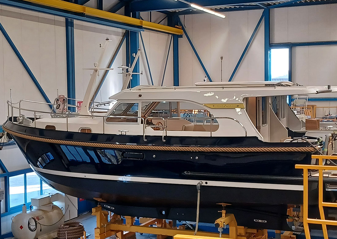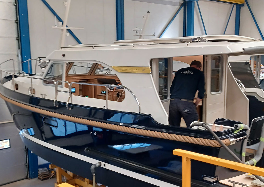 Amy ist fast fertig wie Sie den Bildern entnehmen können. Im Februar übernehmen wir das Schiff und dann kommt es mit dem LKW nach Mirow und wird im März erstmals auf der Seenplatte schwimmen.Dieses Schiff ist ein klassisches Boot für 2 Personen, die in einer geräumigen Doppelkabine im Vorschiff untergebracht sind. Die Kabine hat auch reichlich Schrankplatz und ist durch die Ausführung im warmen amerikanischen Kirschholz und den beiden Leselampen extrem gemütlich. Achtern der Vorkajüte schliesst sich an Steuerbord die Dusche mit bequemer Holzbank und Stehhöhe an. Backbord ist die völlig getrennte heizbare Nasszelle mit elektrischer Toilette und Waschbecken. Der große Salon bekommt eine besonders markante Note durch den Steuerstand mit einer Sitzbank für 1 Person. Die Salonbank hat das „easy convert system“ von Linssen. hier können also 2 weitere Personen schlafen. Das große, teakbelegte Achterdeck wird durch eine variable Cabriopersenning vor schlechtem Wetter geschützt, bei schönen stehen Ihnen viele Möglichkeiten und Varianten einer Teil- bis vollständigen Öffnung zur Verfügung. Eine Bank, ein Teaktisch und zwei bequeme Stühle runden das Mobiliar ab. Die Amy besitzt ein verlängertes Dach (Longtop), das die Plicht noch stärker in den Salon integriert. Ein weiteres Highlight ist das sehr große Variodeck über dem Steuerstand, ein Schiebedach, das Ihnen während der Fahrt das Gefühl eines Außensteuerstandes vermittelt. Vom Achterdeck gelangen Sie durch ein bequemes, ebenerdiges Türchen auf die Badeplattform, wo selbstverständlich eine stabile klappbare Badeleiter mit Teakstufen sowie eine Kalt/Warm-Wasser Dusche das Baden zu einem Genuss werden lassen.